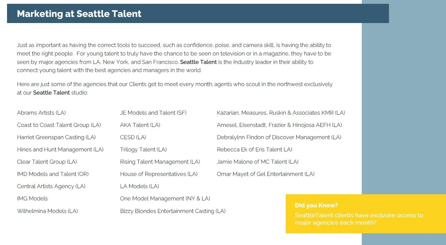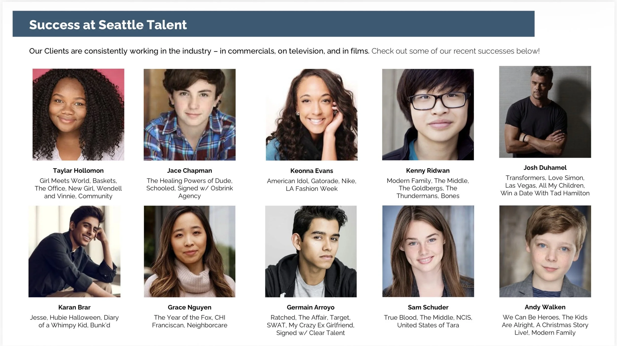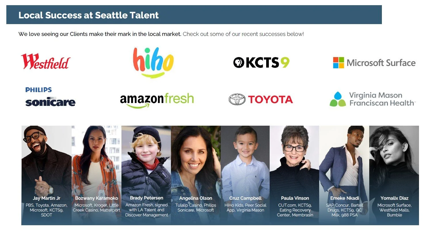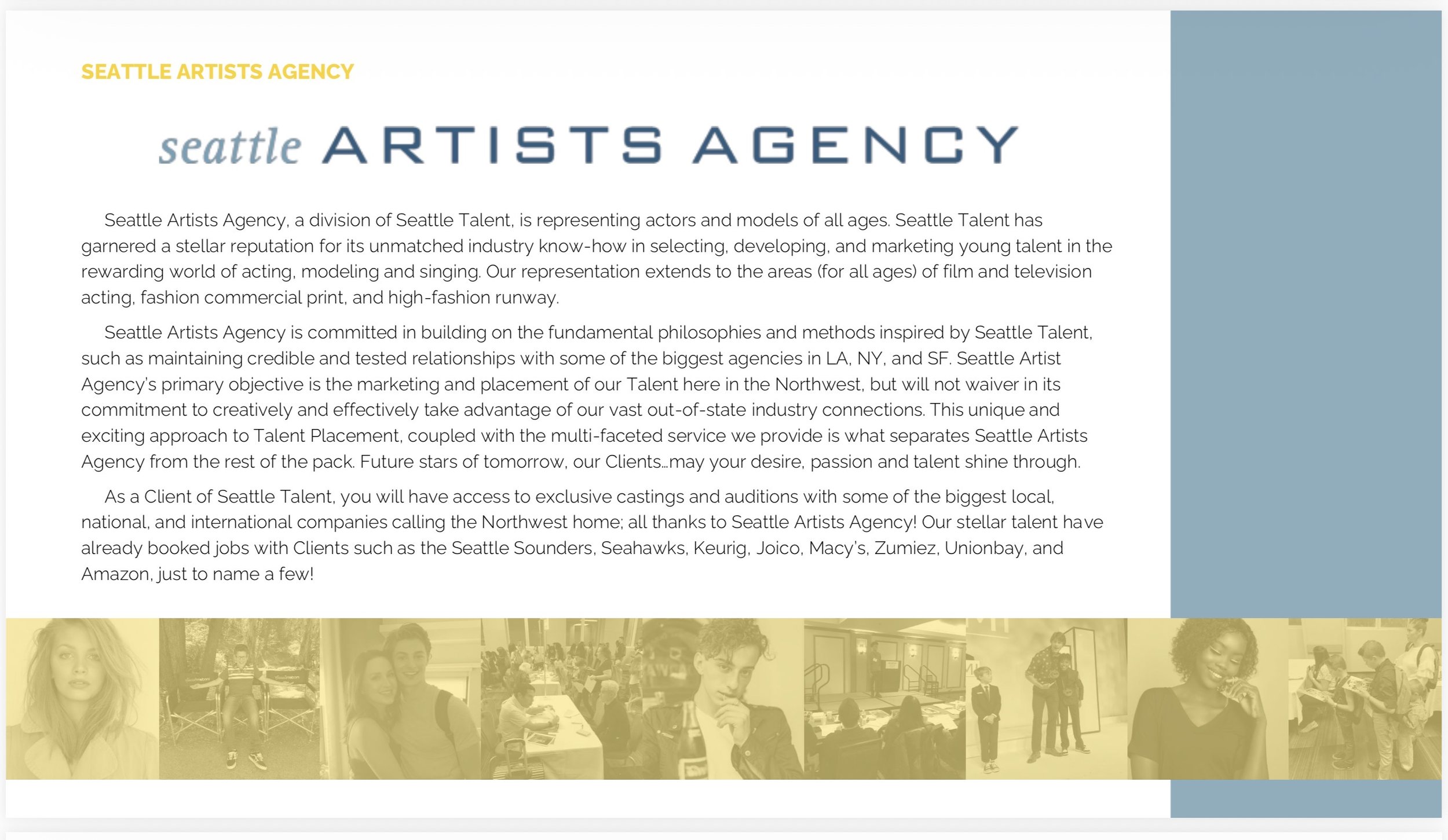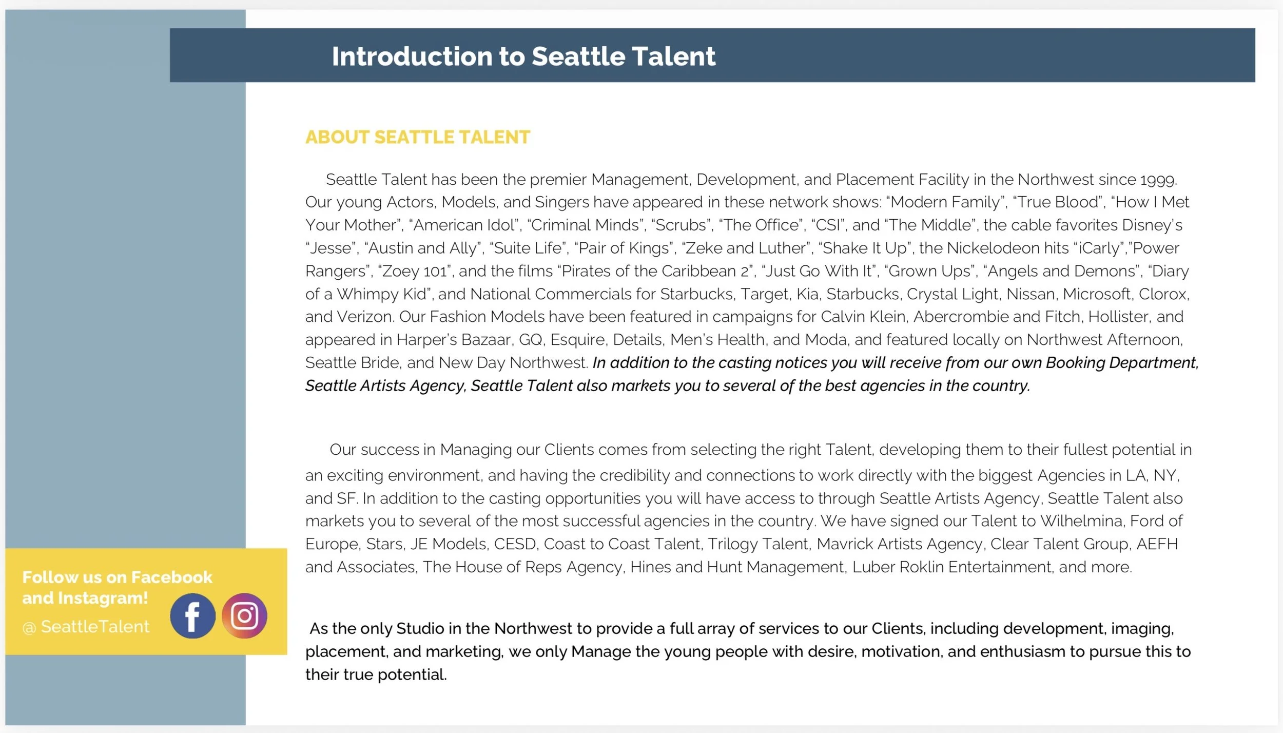 The Seattle Talent team will deliver comprehensive development and preparation, building on your current strengths while developing the professional skill sets needed to lay the groundwork for a sustained career in the entertainment industry. All areas of development are available to this actor, model, voice-over artist, influencer, singer, and brand ambassador.