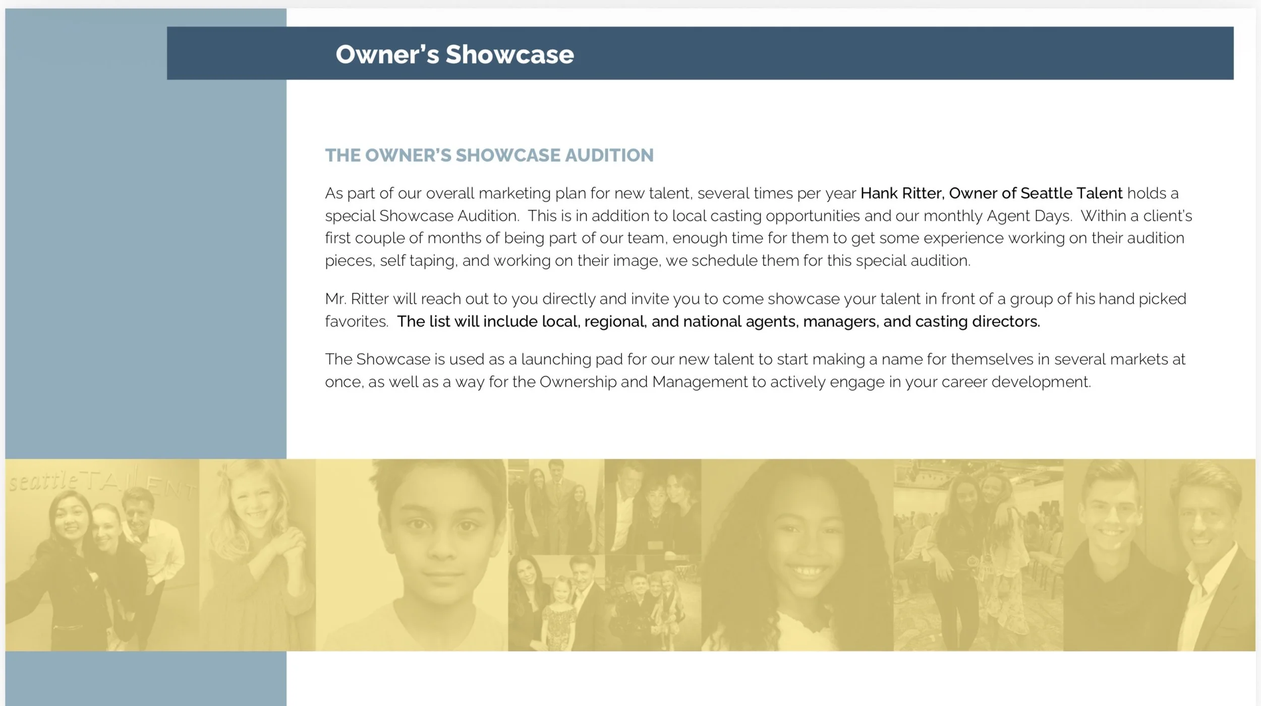 The Seattle Talent team will design a personalized development strategy. Building on your current strengths while expanding the key skill sets needed to reach your goals in the entertainment industry.